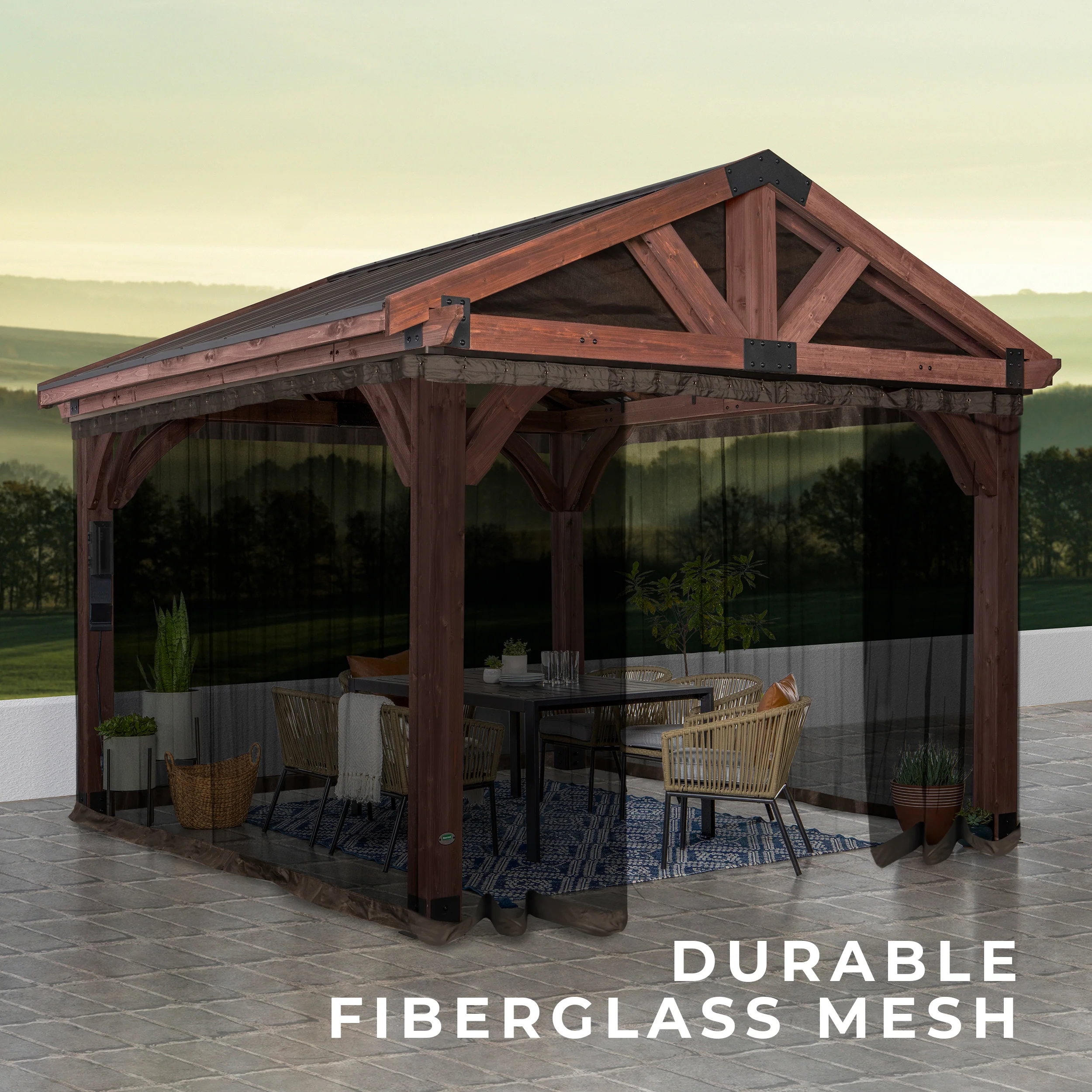 Enjoy serene outdoor moments with Backyard Discovery's Arlington Gazebo Mosquito Net Kit. This sophisticated mesh kit delivers superior protection from unwanted pests, transforming your patio gazebo into a comfortable oasis. The netting is crafted from high-quality fiberglass mesh, ensuring lasting durability while preserving clear views and optimal ventilation throughout your gazebo. The netting panels are designed to hang outside the gazebo posts, maintaining full use of the interior space while keeping bugs out. Experience effortless operation with smooth-glide tracks that install easily and allow the panels to move seamlessly. Each netting panel features durable double-sided zippers and convenient post ties that secure the panels aside when you want to enjoy an open, airy setting. Built-in pockets at the bottom the panels conveniently let you add weights or sand to keep your netting secure on windy days. The robust fiberglass mesh stands up to the elements while keeping your outdoor space naturally bug-free all season long. Whether hosting backyard parties or enjoying peaceful morning moments, this premium netting kit creates the perfect environment for year-round outdoor living. Backed by a 5-year warranty, this heavy-duty mosquito net kit elevates your Arlington Gazebo into a comfortable retreat you can enjoy throughout every season.