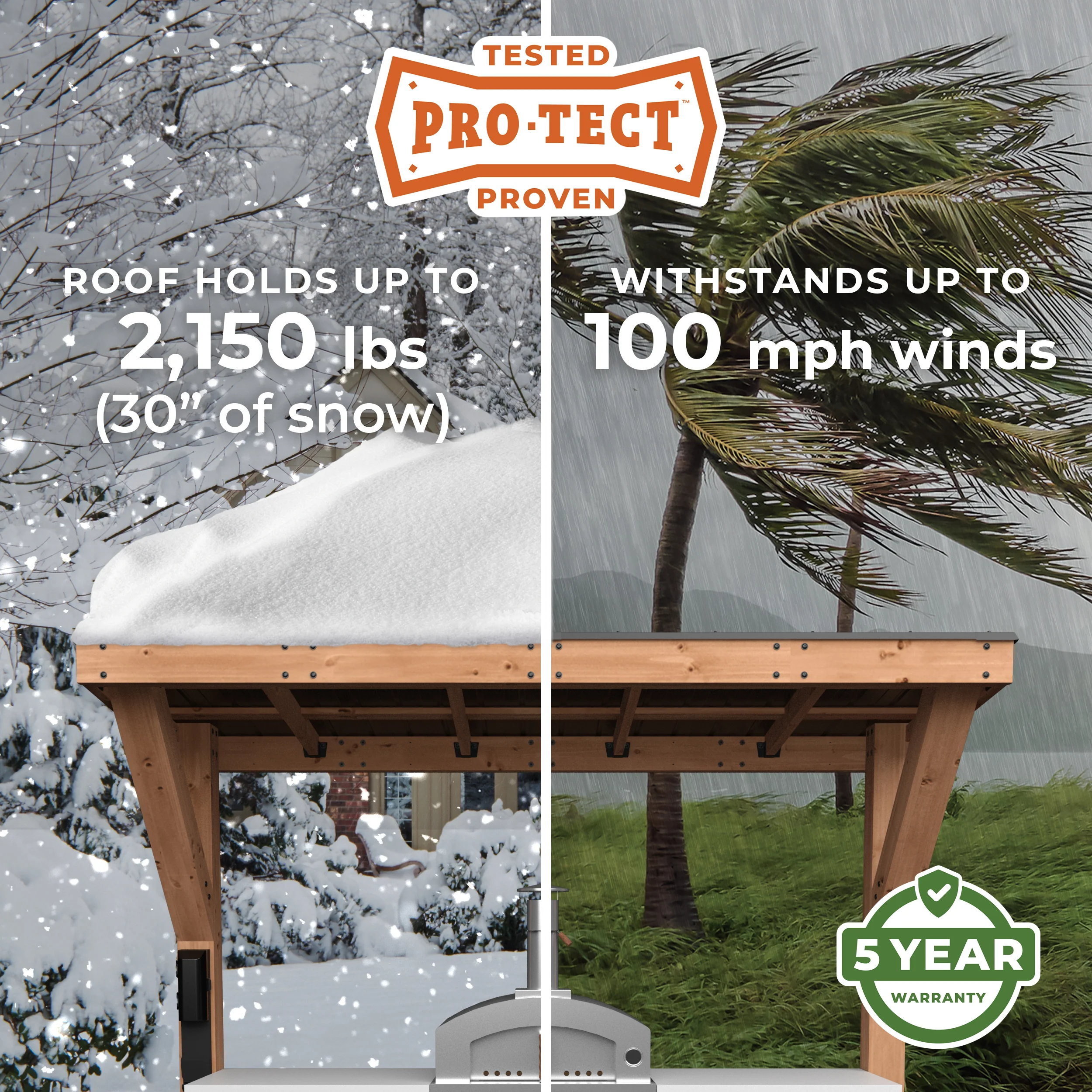 Designed for outdoor baking, the Timber Rock Pizza Oven Cooking Station brings authentic pizzeria-style pies to your backyard. Built from solid cedar and powder-coated galvanized steel, this outdoor cooking station is made to resist rust, dents, and corrosion so your backyard kitchen stays looking great and delivers high performance year after year. The premium built-in 32-inch pizza oven makes it easy to create traditional pizzas and other baked goods right at home. Designed from durable 304 stainless steel with firebrick and ceramic-lined walls, it reaches up to 800°F and has plenty of space to fit two 12-inch pizzas at once for fast, even baking. The modern cantilever roof features Pro-Tect™ tested construction that’s proven to withstand up to 2,150 pounds of snow load and 100 mph winds for all-weather protection. Sleek quartz countertops give you space to prep ingredients or plate dishes, while drawers and open storage keep all of your tools and cooking accessories organized. With a ready-to-assemble design and step-by-step BILT® instructions, you’ll have your cook station ready to use in no time. Built for creating fresh, home-cooked favorites, this outdoor kitchen station is ready for everything from delicious crisp pizzas to slow-roasted meats and tasty baked sides.
